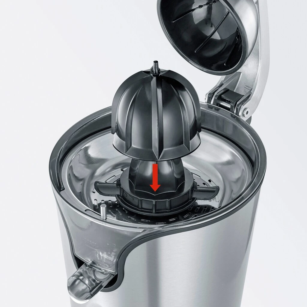 | Weitere Vorteile | Fruchtfleisch-Regulator für individuellen Genuss. Einfache Regulierung des Fruchtfleischanteils durch zwei entnehmbare und verstellbare Edelstahl- Siebe.Einfache Reinigung und spülmaschinengeeignete Einzelteile.Bewegliche Auslauftülle mit Tropfstopp-Funktion.Ausgestattet mit zwei unterschiedlich großen Kegelaufsätzen: Für große und kleine Früchte. |