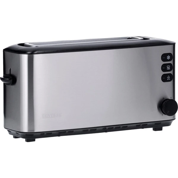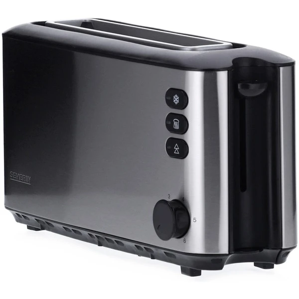 Mit dem Severin Toaster AT 2515 kann man sowohl Toasten als auch Auftauen und Erwärmen. Im Toaster AT 2515 finden zwei Toastscheiben gleichzeitig ihren Platz. Die Röstzeitelektronik mit Temperatursensor sorgt für den genau richtigen Röstgrad, den man natürlich vorher über den Drehschalter eingestellt hat. Die Auftaustufe und die Aufwärmstufe werden jeweils mit einer Kontrollleuchte angezeigt. Die Toastscheibenzentrierung sorgt für die gleichmäßige Bräunung beider Seiten, während die Lift-Funktion zur leichteren Entnahme der Toastscheiben dient. Sicherheitshalber gibt es noch eine separate Auslösetaste mit Kontrollleuchte. Mit Krümelschublade, integriertem Brötchen-Röstaufsatz, dem wärmeisolierenden Edelstahlgehäuse und der Kabelaufwicklung lässt der Toaster AT 2515 keine Wünsche offen.