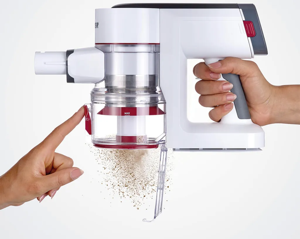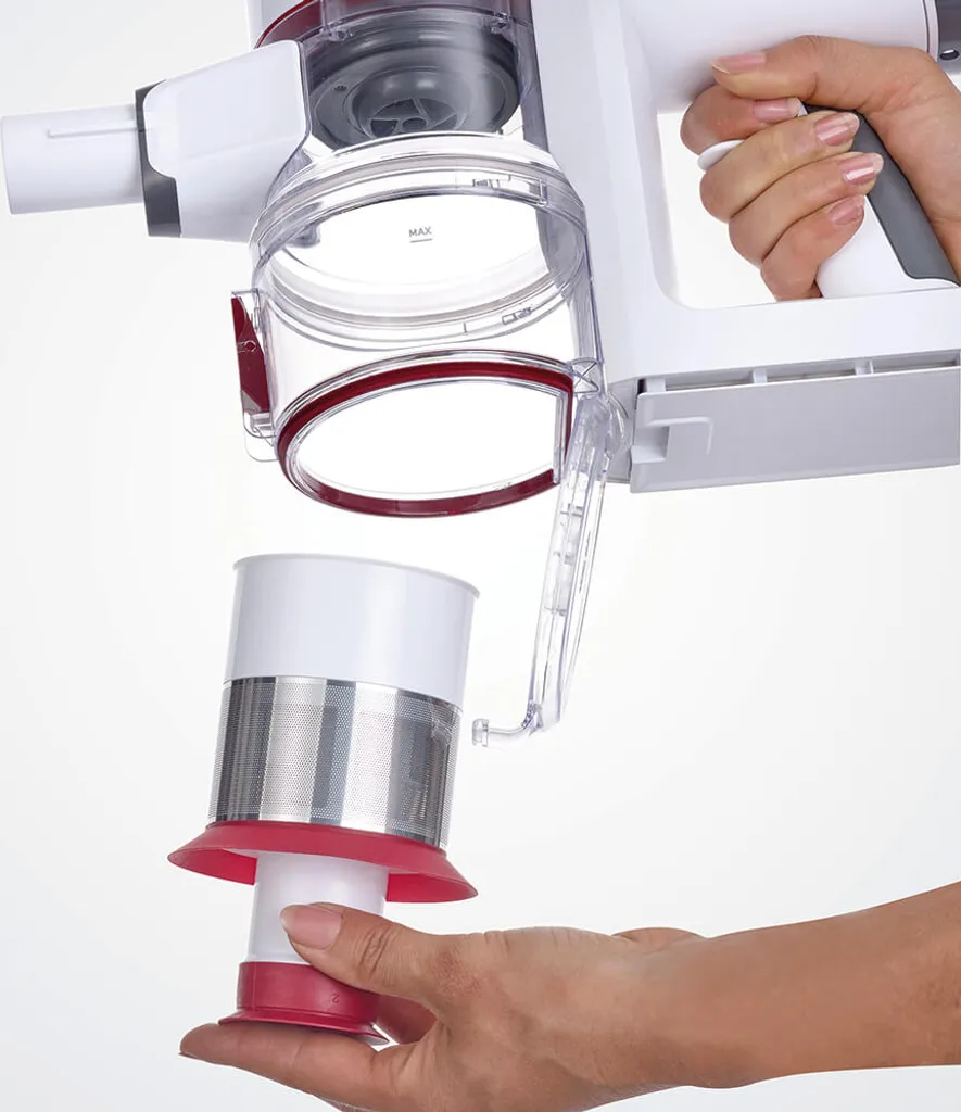 Doch nicht nur die Performance überzeugt, auch die einfache Reinigung ist ein echtes Highlight. Der Behälter kann direkt über der Mülltonne geöffnet werden, sodass der aufgenommene Staub ohne zusätzliche Berührung entsorgt werden kann. Der Filter kann via Drehbewegung entnommen und unter Wasser gereinigt werden – so bleibt der Staubsauger nachhaltig ein treuer Begleiter.