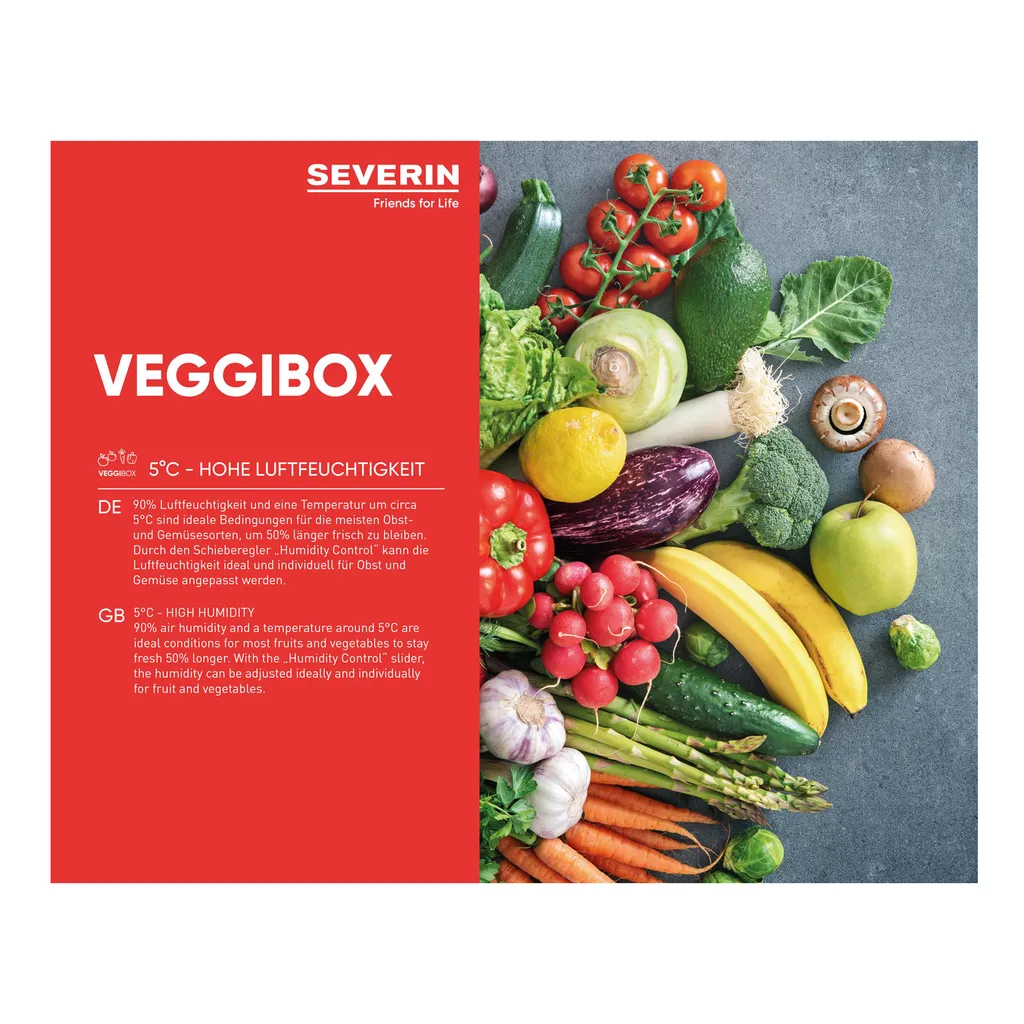 90% Luftfeuchtigkeit und eine Temoperatur um ca. 5°C sind ideale Bedingungen für die meisten Obst- und Gemüsesorten, um 50% länger frisch zu bleiben. Durch den Schieberegler ‚Humidity Control‘ kann die Luftfuechtigkeit ideal und individuell für Obst und Gemüse angepasst werden.