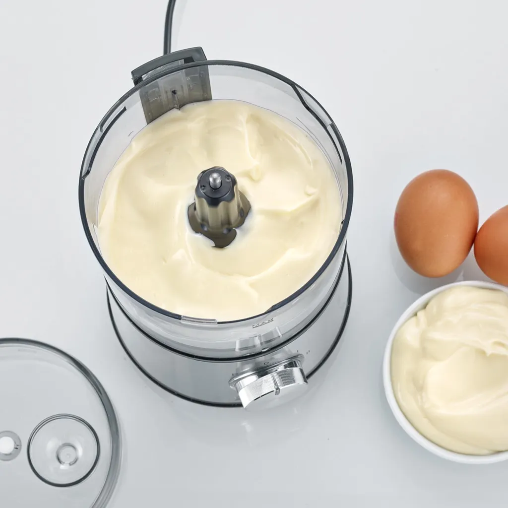 Der kompakte Multizerkleinerer eignet sich zum Schneiden und Raspeln, sowie für die Zubereitung von Mayonnaise, Schlagsahne uvm.