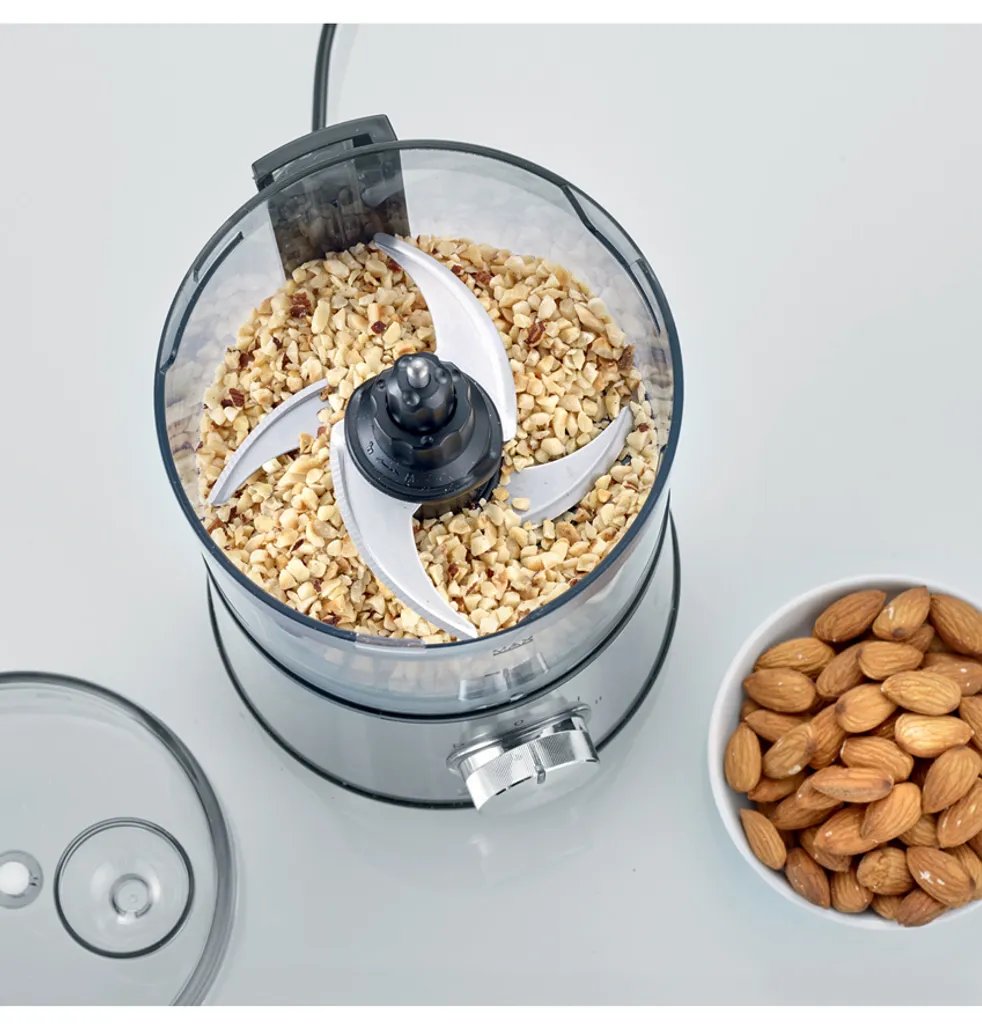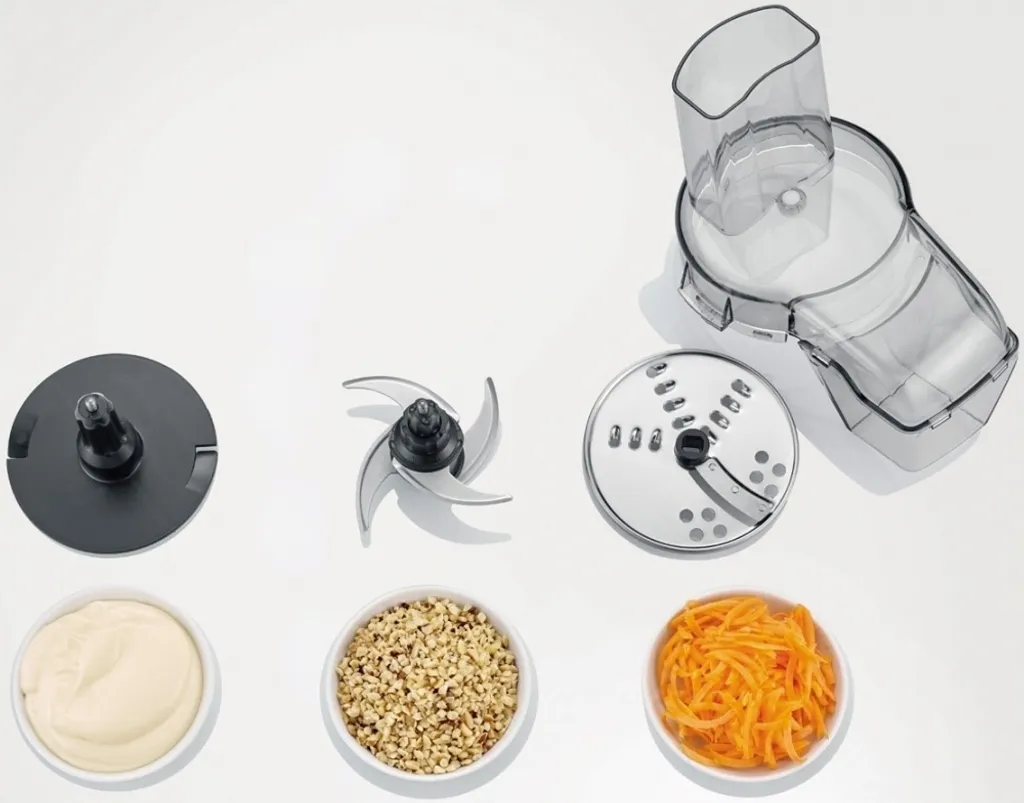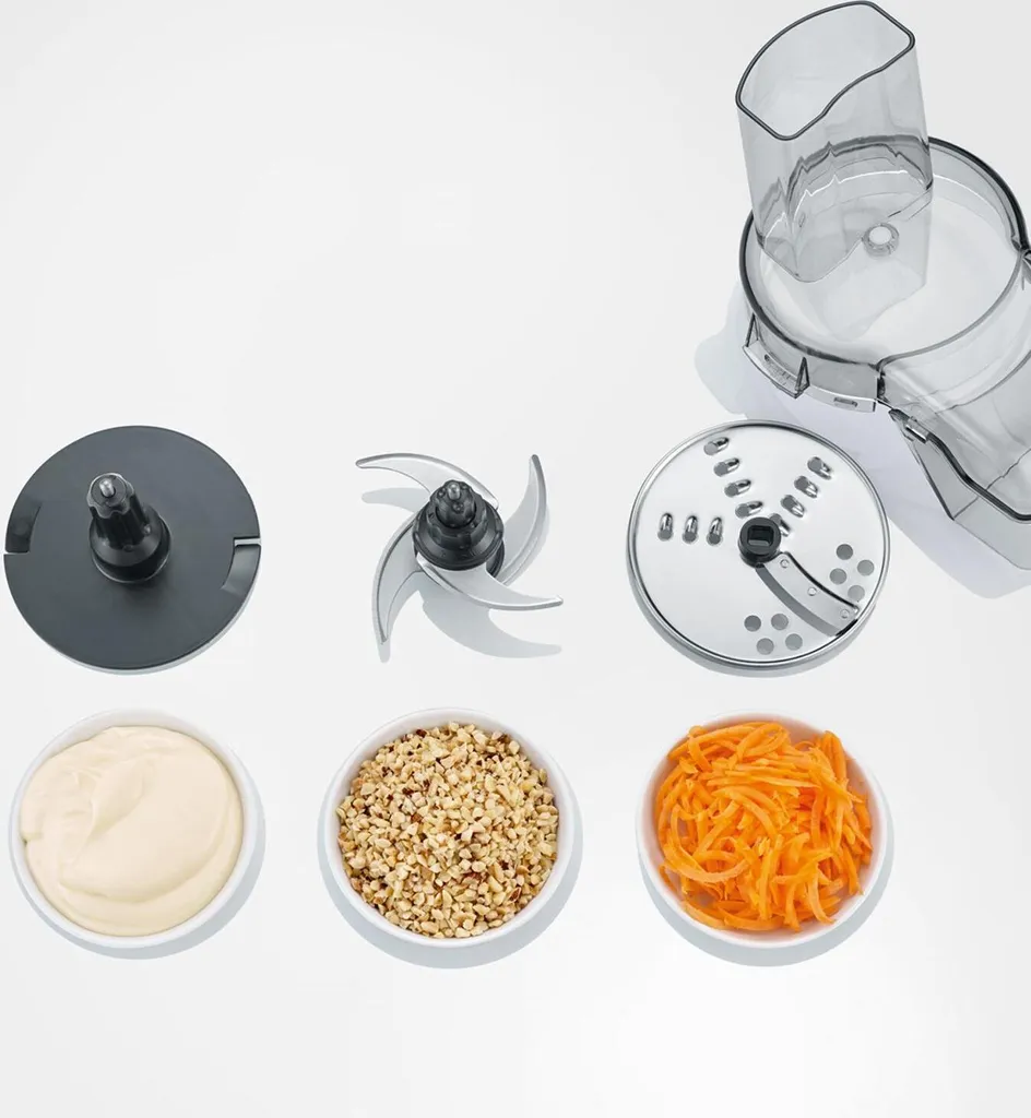 Wielofunkcyjny rozdrabniacz „4-w-1” o dużej mocy w wersji kompaktowej, wykonany ze stali nierdzewnej z praktyczną przystawką do szatkowania i rozdrabniania. Idealny do przygotowania sałatek i surówek, placków ziemniaczanych, pieczonych ziemniaków i wielu innych potraw.