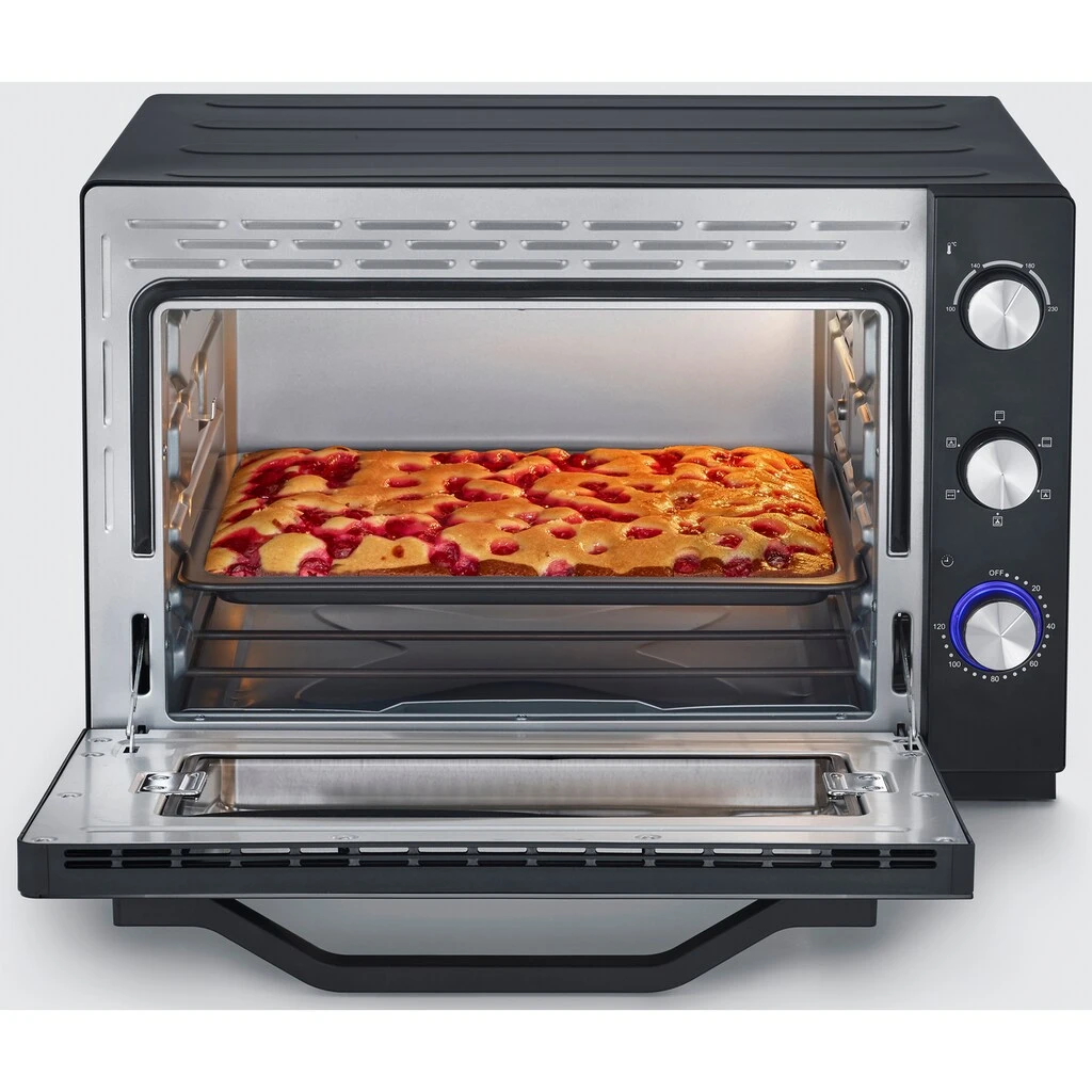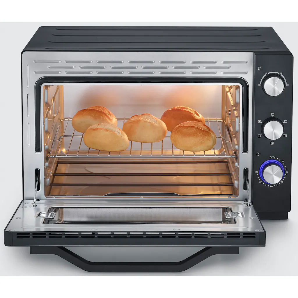 - Vielfältige Zubereitungsmöglichkeiten von Pommes bis Kuchen dank Ober-/ Unterhitze, Umluftfunktion und mitgeliefertem Grillrost und Backblech