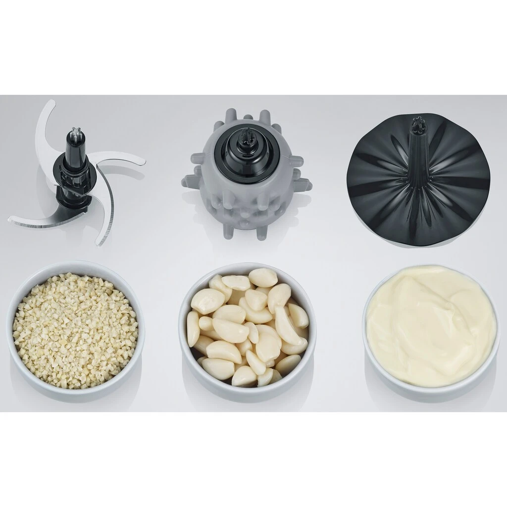 Umfangreiches Premium-Zubehör: – 4 Klingen-Messereinsatz auf zwei Ebenen für besonders gleichmäßige Ergebnisse Ideal zum Zerkleinern von Kräutern, Zwiebeln, Fleisch, Käse, Mandeln / Nüssen, Crushed Ice uvm. – Emulgier-Scheibe zur Zubereitung von Sahne, Eischnee, Mousse uvm. – innovativer Knoblauch-Schäleinsatz – Anti-Rutsch-Ring für den Arbeitsbehälter – Ladenetzteil